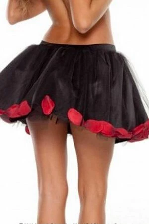 Black satin petticoat which features an elastic waistbamd and black tulle outter layer which encloses faux rose petals. **Sizing Note – One Size should work for you, if you normally wear XS, SM, MED, and sometimes LG.