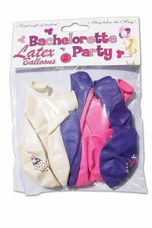 Bachelorette Party Latex Balloons from Hott Products. Each bag contains 12 balloons in pink, white and purple.