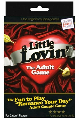 Romance your day and have fun while you play! Most couples agree that they need to find the right balance in their relationship between sex and romance. Guys tend to lean toward the sex part; women would like to see a bit more romance. A Little Lovin is the fun and explicit couple’s game that opens the door to both sex and romance. Game is for 2 adult players and contains 54 A Little Lovin’ cards, 50 Lovin’ List cards and a rule booklet. Isn’t it time both of you win?