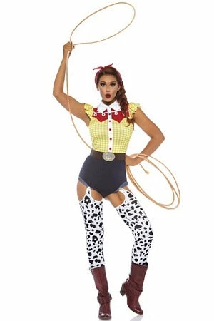 3PC. Giddy Up Cowgirl costume features western romper with attached cow print leggings, belt, and matching bandana.