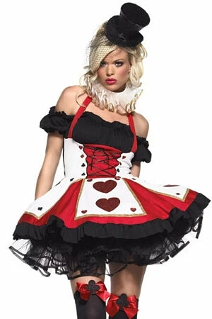 Rule your next costume party with this Queen of Hearts Costume. The sexy set includes a flirty dress and ruffled neck piece. The sassy off-the-shoulder dress laces in the front for a corseted look, zips up the back for convenience and ties at the neck halter-style. The fit and flare dress has gold and black glitter. The ruffled collar will fit up to a 14 inch neck. Hat, petticoat and thigh highs are sold separately.