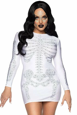 The spandex rhinestone skeleton dress by Leg Avenue is the ultimate sexy Halloween costume party dress. With exquisite rhinestone bone detail, you can be spooky cute at the club or party on Halloween night. Pair with fishnet thigh highs and face jewels to take your look to the next level.