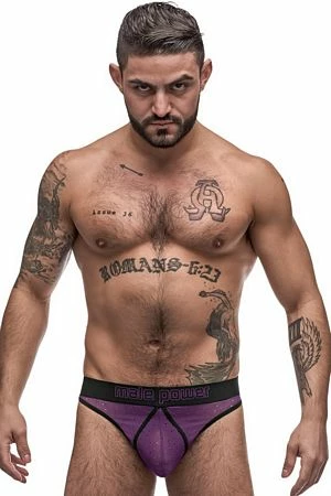 From the Airotic Mesh collection by Male Power: A thong featuring nylon-spandex trim, an enhancing pouch, a thick, yet, comfortable 1.5 inch back, and a branded elastic waistband. 85% Polyamide 15% Spandex