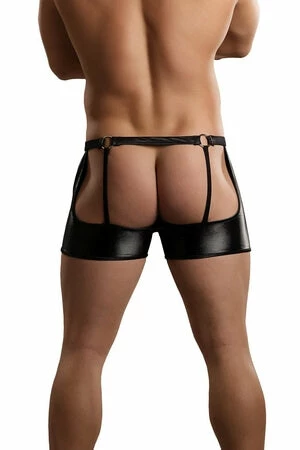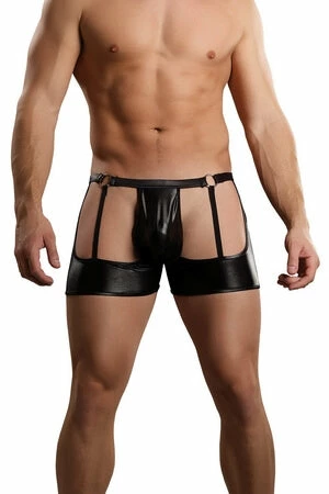 Garter short features comfort fit pouch, front and back attached garter straps, cire waistband with metal ring detail and cire trim.
