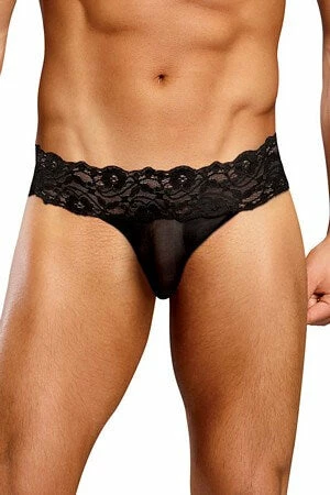 Lace micro thong features mesh pouch with cire trim, thick floral lace waistband and pinched lace thong back.