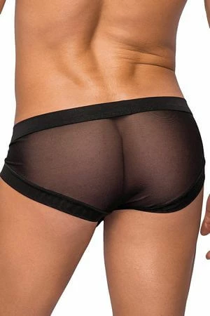 Micro mini short, lowrise waist, ultra high cut legs, plush cotton waistband, stamped logo, shaft pouch. Sheer with all way stretch, lightweight, breathable fabric. 95% Polymide 5% Spandex