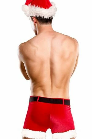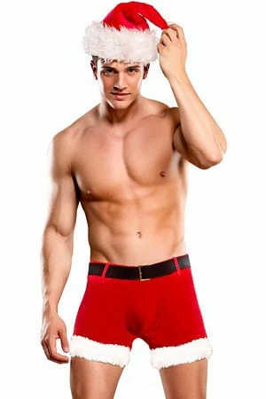 Ho! Ho! Ho! Merry Christmas to YOU! This costume features red spandex shorts with white fur trim at leg opening and black belt. Matching red hat included.