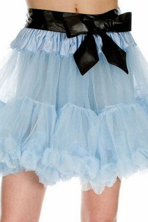 Sexy blue tulle petticoat which features ruffled trim and black bow tie belt. **Sizing Note – One Size should work for you, if you normally wear XS, SM, MED, and sometimes LG.