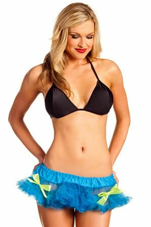 This tantalizing mini petticoat features a neon blue mini petticoat with elastic band waist and neon yellow bow details. **Sizing Note – One Size should work for you, if you normally wear XS, SM, MED, and sometimes LG.
