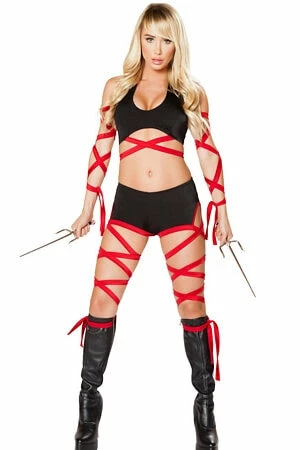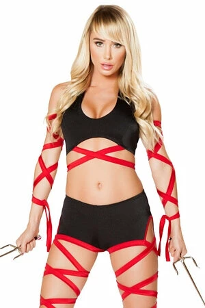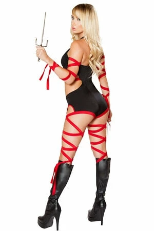 Deadly Assassin Costume includes a cutout romper with attached leg strap detail and a pair of arm straps.