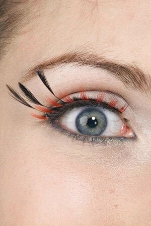 Dramatize your eyes with these theatrical red ostrich spotted eye lashes. These striking ostrich eyelashes accentuate every sexy wink of your eye. The perfect finishing touch for sexy costumes and sexy burlesque or other stage looks.