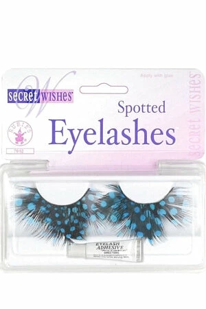Dramatize your eyes with these theatrical teal spotted eye lashes. These striking spotted eyelashes accentuate every sexy wink of your eye. The perfect finishing touch for sexy costumes and sexy burlesque or other stage looks.