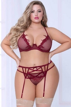 Three piece bra set includes netting bra with lace appliqué overlay, velvet elastic, adjustable straps, underwire cups, hook and eye back closure, and gold hardware. Strappy garter belt with back hook and eye closure and thong with front lace appliqué.