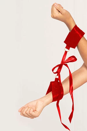 Play a little naughty game with these sexy satin cuffs featuring double satin cuffs, gold D-ring accents, and a satin self tie.