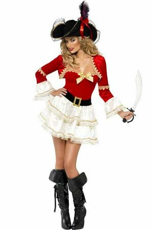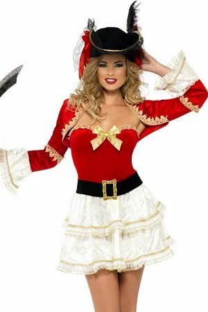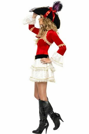 Go out and find some booty with this pirate costume which features red top with gold bow between the bust, white dress, black belt and matching red and white jacket. Sword, hat and boots sold separately.