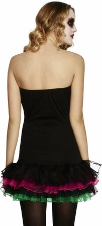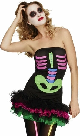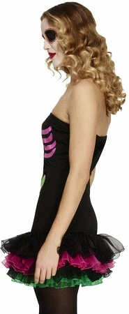 Rattle some bones tonight in this Fever Neon Skeleton Costume that comes to you featuring contrasting neon colors set against super soft form fitting material with ruffled tutu dress.