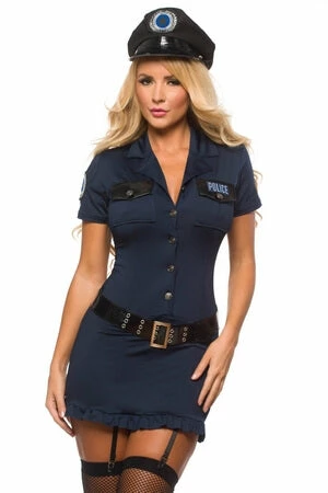Our sexy police officer costume by Velvet Kitten is a five-piece sexy cop costume from Lingerie Diva that’s sure to get you pulled over for a closer look. The form-fitting short-sleeved “cop” dress has a button front that can be worn buttoned up or unbuttoned for a slutty police costume look. This sexy adult costume comes with fake police hat, fake badge, black belt and garters. The short police officer dress is hemmed with flirty ruffles.