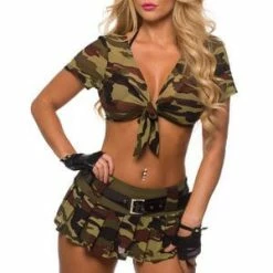 Command his attention in this Boot Camp Babe Costume. Featuring back tying triangle bra, cap sleeve wrap with front tie, pleated skirt with removable belt, matching g-string. This sexy set also includes pleather fingerless gloves, camo hat and fishnet thigh high stockings.