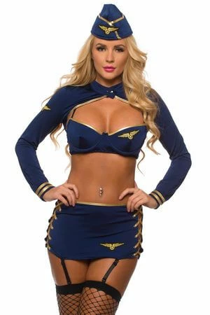 Our Cockpit Cutie adult costume from Lingerie Diva is an outfit no ordinary stewardess will wear outside her bedroom. This navy blue sexy stewardess costume by Velvet Kitten has lots of cutouts on a blue “uniform” two-piece outfit. The top has long sleeves and a cutout front above and beneath the molded underwire cup bra with adjustable shoulder straps. The short skirt has gold lace tie-ups designed to show skin at your hips and thighs.