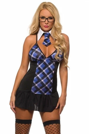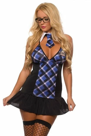 You’re sure to get straight A’s in this Extra Credit School Girl Costume featuring a black and blue plaid mini dress with triangle cups, adjustable spaghetti straps, ruffled skirt, white collar with snap closure, neck tie with velcro closure, adjustable belt, glasses, and fishnet thigh high stockings.