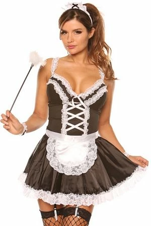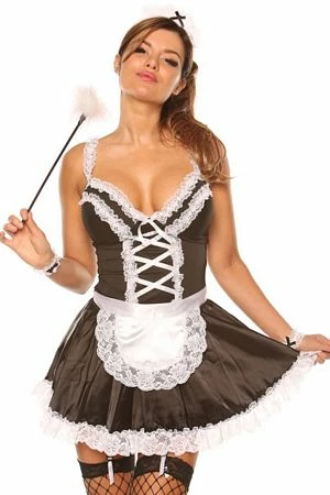 This seductive Maid for you costume features a satin like dress with white ruffle lace, adjustable shoulder straps, tie back apron, faux lace up front, adjustable garter straps, feather tickler, lace headband and lace wrist cuffs.