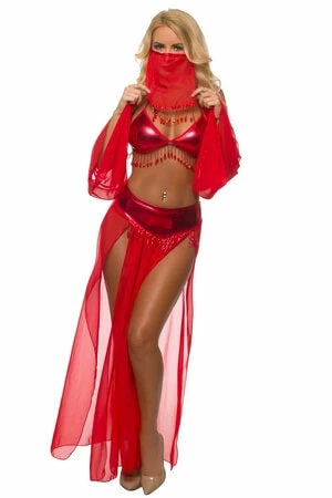 Be mysterious in this National Customs Costume featuring a sheer long red skirt with side slits, elastic waist, beaded accents, a matching triangle cup top with halter neck ties and back ties, matching sleevelettes, face veil, and thong.