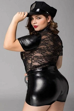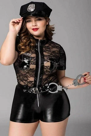 This sexy queen frisky cop costume includes a black lace and wet look romper with zip up front, front buckle belt, double front pockets, police hat and plastic handcuffs.