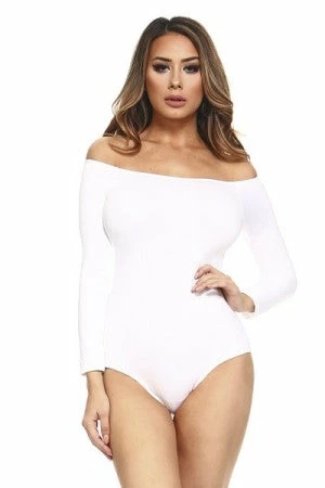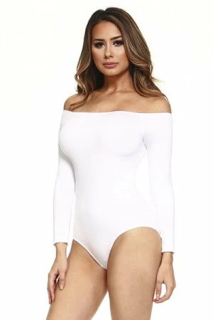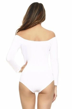 A best-selling silhouette constructed from nylon spandex fabrication for a smooth feel and figure-flattering wear. The Nylon Spandex Off-Shoulder Long Sleeve Bodysuit features off-the-shoulder long sleeves and a Bikini cut bottom. This bodysuit fits true to size with moderate stretch.