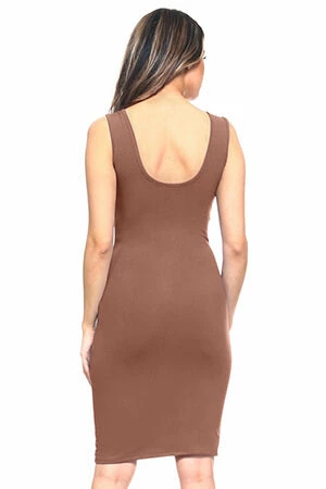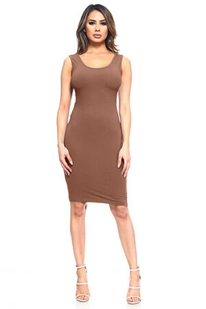 The traditional tank dress is in for the long haul with memory fibers that hugs those curves like an hour glass. Extended hemline ends below the knee in classic midi styling.