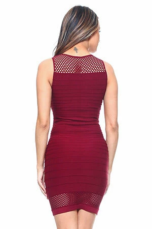May the fierce be with you! A daring and show stopping bandage bodycon dress featuring a round netted panel at neckline and at hem, making this dress anything but innocent. Hugs your body just right with a form fitting bodice and above the knee length.
